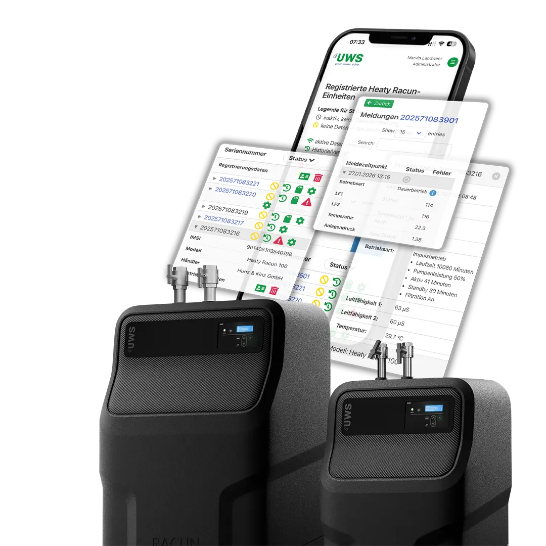 Alle Daten aus der WaterBoy App werden automatisch normgerecht dokumentiert und sind jederzeit abrufbar. Gleichzeitig liefern intelligente Heaven7 Geräte wie die Racun-Serie oder Nachspeiselösungen wie die Heaty Complete PROfessional wichtige Informationen direkt in die Cloud – etwa bei Leckagen oder wenn Vadion pH-Control Mischbettharz verbraucht ist.